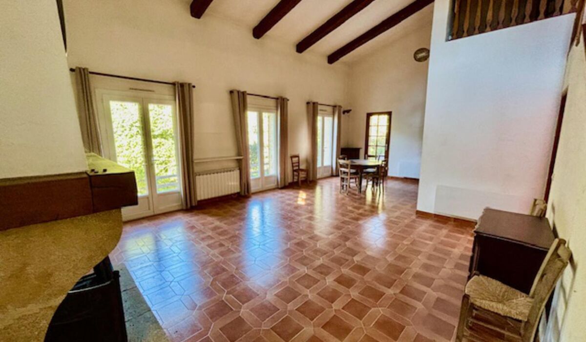 - Belle pièce de vie avec cheminée et plafond cathédrale d'environ 37m² environ, ouvrant sur une terrasse couverte et terrasse donnant sur l'espace piscine.